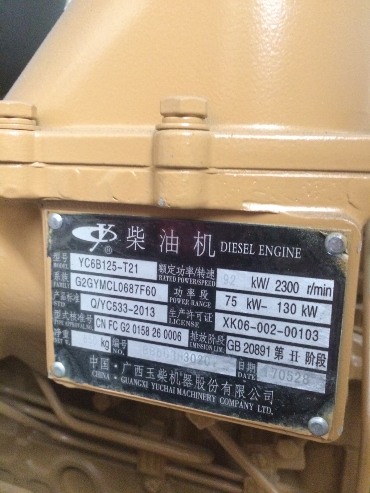 Двигатель YUCHAI YC6108G, YC6B125-T21